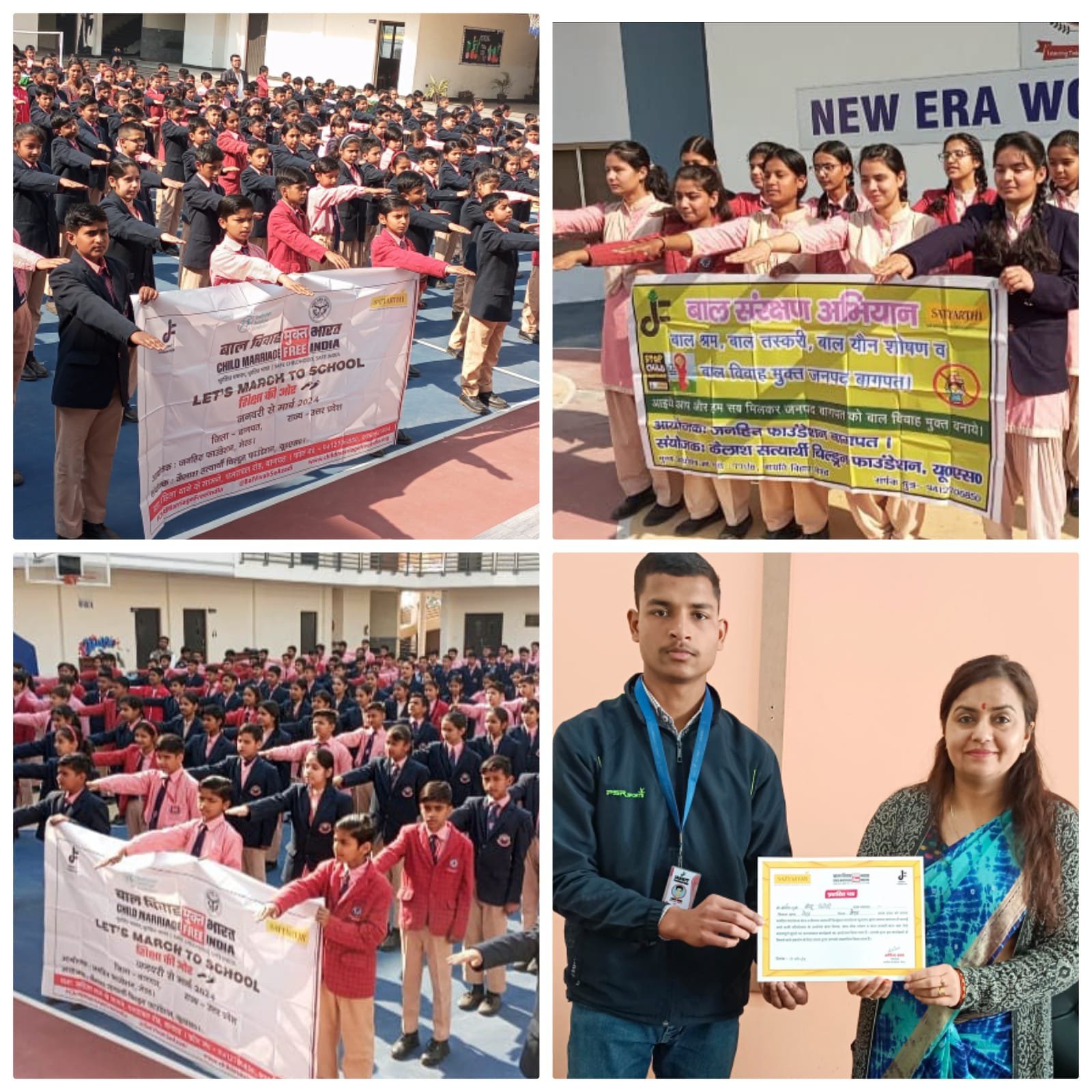 बागपत: सोमवार को न्यू ऐरा पब्लिक स्कूल में जनहित फाउंडेशन द्वारा कैलाश सत्यार्थी चिल्ड्रन फाउंडेशन के सहयोग से बच्चों को शिक्षा के बारे जागरूक किया गया जनहित फाउंडेशन के पदाधिकारी गण स्कूलों में जाकर बच्चों को बाल अपराध मुक्त बागपत बनाने के लिए शपथ के माध्यम से रैली के माध्यम से निबंध प्रतियोगिता,भाषण प्रतियोगिता के माध्यम से बालक एवं बालिकाओं को जागरूक करने का कार्य कर रहे है ।