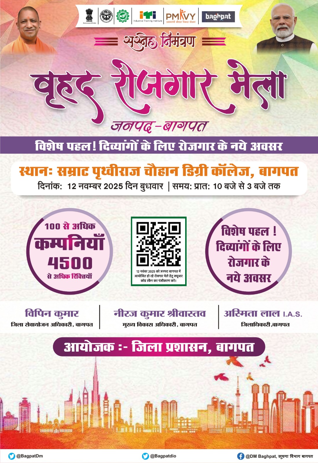 बागपत, 10 नवम्बर 2025 — जिले के युवाओं, महिलाओं और दिव्यांगजनों के लिए रोजगार का एक बड़ा अवसर उपलब्ध होने जा रहा है। उत्तर प्रदेश रोजगार मिशन के अंतर्गत जिलाधिकारी अस्मिता लाल की पहल पर 12 नवम्बर को सम्राट पृथ्वीराज चौहान डिग्री कॉलेज परिसर में वृहद रोजगार मेले का आयोजन किया जाएगा। प्रशासन के अनुसार यह मेला न केवल युवाओं को रोजगार उपलब्ध कराने में सहायक होगा, बल्कि स्थानीय स्तर पर कौशल और उद्योग को जोड़कर बागपत को आत्मनिर्भर एवं औद्योगिक रूप से सशक्त बनाने की दिशा में महत्वपूर्ण कदम साबित होगा।