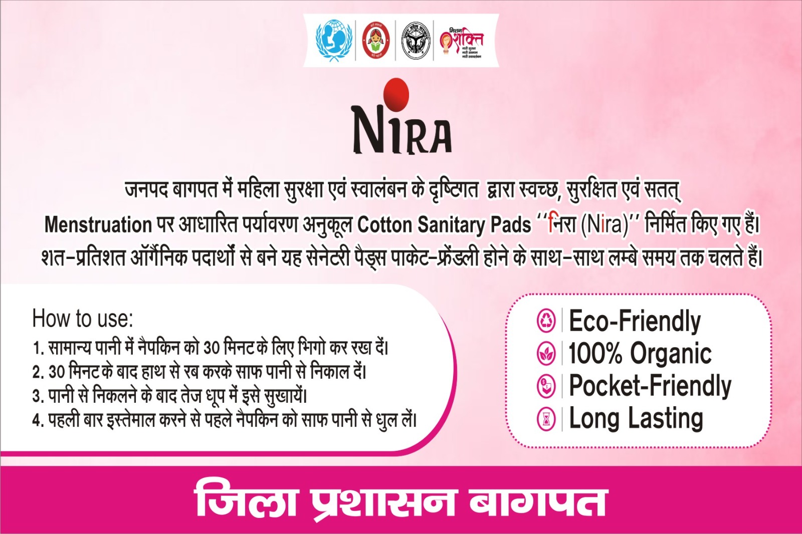 जिलाधिकारी आईएएस अस्मिता लाल के संवेदनशील नेतृत्व में रामा मेडिकल कॉलेज के सीएसआर और यूनिसेफ इंडिया एवं इंडियन रेड क्रॉस सोसायटी के सहयोग से कल नगर पालिका बड़ौत में रविदास मंदिर वार्ड संख्या 01 में दोपहर 12.00 बजे आयोजित विशेष समारोह में निरा पहल शुरू की जाएगी जिसमें महिलाओं को 100% कॉटन से बने री-यूज़ेबल सेनेटरी पैड उपलब्ध कराए जाएंगे जिन्हें दो से तीन साल तक इस्तेमाल किया जा सकता है। बागपत इस मॉडल को लागू करने वाला देश का प्रथम जिला है। इन पैड्स में प्लास्टिक या केमिकल का उपयोग नहीं किया गया है, जिससे संक्रमण का खतरा कम होता है और पर्यावरण पर भी बोझ नहीं पड़ता। यह महिलाओं की गरिमा, स्वास्थ्य और पर्यावरण सुरक्षा से जुड़ा संपूर्ण समाधान है। ये सुरक्षित हैं, प्लास्टिक-रहित हैं, केमिकल-रहित हैं और ग्रामीण परिवारों के लिए आर्थिक रूप से भी बेहद राहत देने वाले हैं।