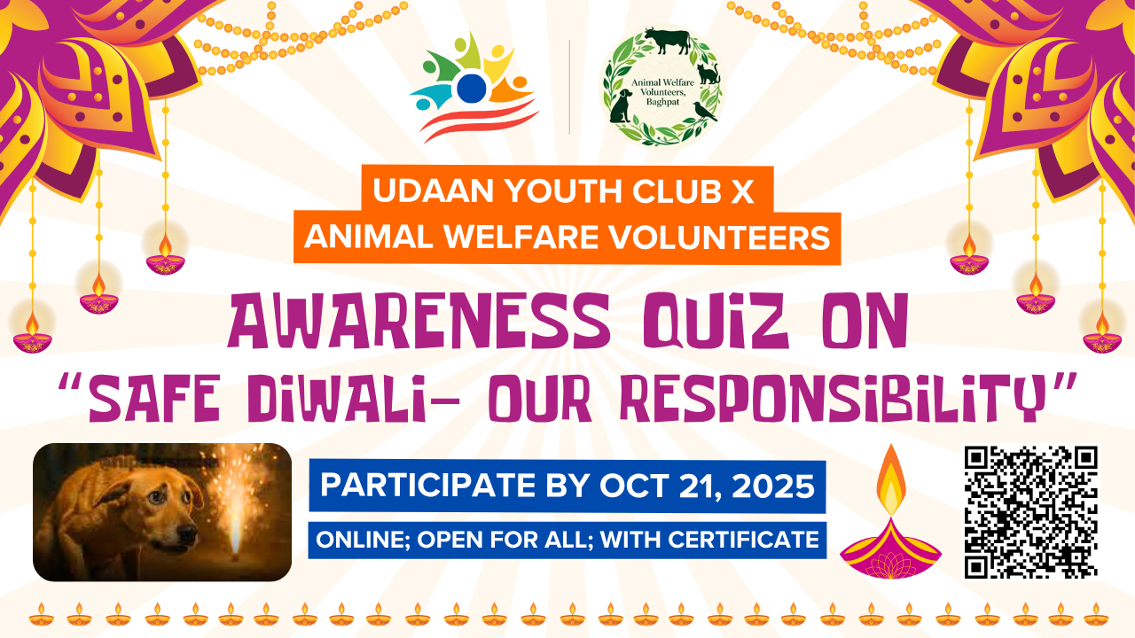 बागपत, 19 अक्टूबर 2025। दिवाली के अवसर पर जब पूरा देश उत्सव की रोशनी में डूबा है, बागपत जिले के युवाओं ने इस त्यौहार को संवेदनशील और जिम्मेदार तरीके से मनाने की दिशा में एक अनूठी पहल की है। जिले की प्रमुख युवा संस्था उड़ान यूथ क्लब और एनिमल वेलफेयर वालंटियर्स के संयुक्त तत्वावधान में “सुरक्षित दिवाली – हमारी ज़िम्मेदारी” थीम पर एक ऑनलाइन जागरूकता क्विज शुरू किया गया है। इस क्विज में भाग लेने की अंतिम तिथि 21 अक्टूबर 2025 तय की गई है।